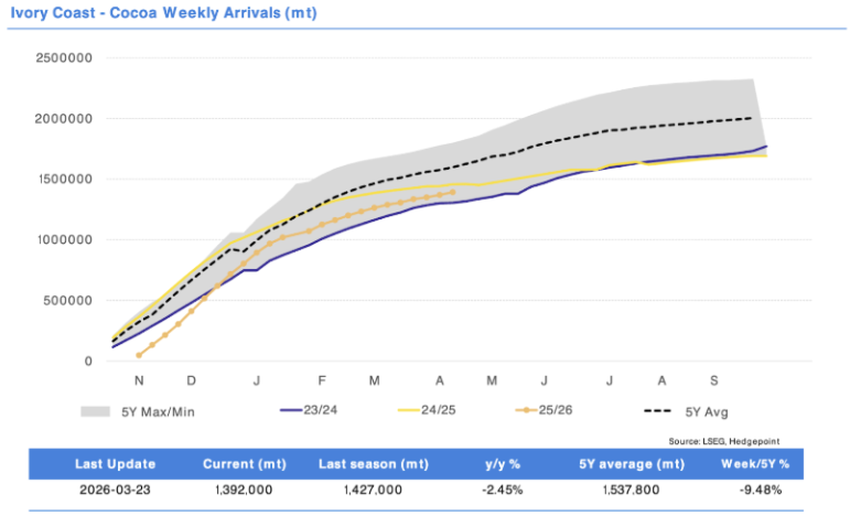 The main cocoa crop in Ivory Coast for this season is ending at about the same level as last season, with 1,392,000.00 tons delivered to ports compared to 1,427,000.00 tons a year earlier. These figures are worse than the average over the past five years.