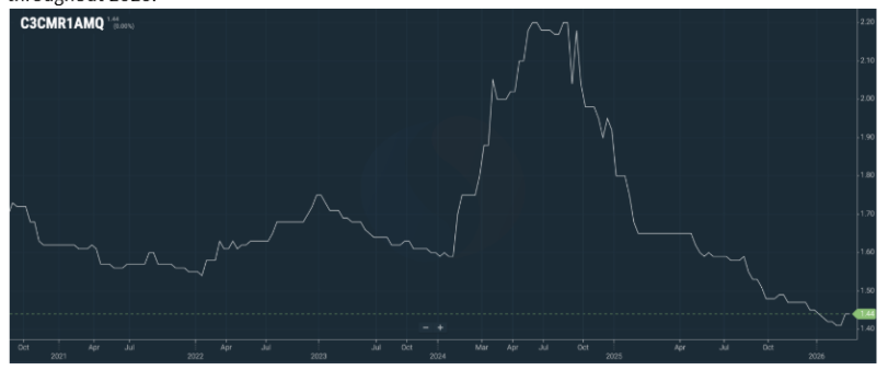 Cocoa Liquor Ratio has remained stable for several months at 1.44, with an upward trend expected throughout 2026.