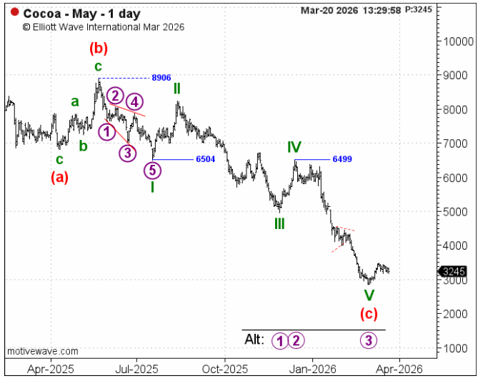 As previously noted in our reports, based on cocoa market movements, further correction is quite possible according to an alternative wave count (currently in wave 4, with a potential wave 5 decline toward $2,000.00 on the New York Exchange).