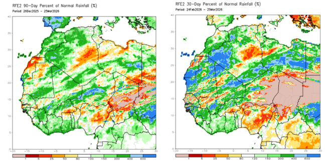 Rainfall in West Africa over the past 30 and 90 days has been significantly above normal, which should positively affect crop development during the June–September 2026 harvest period.