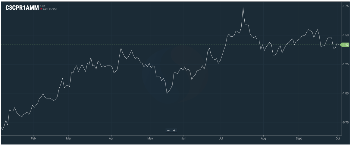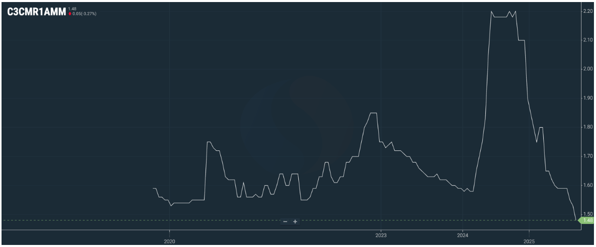 1.48, with a stable upward trend expected to reach 1.6 by the 2nd quarter of 2026. At the current exchange market level, the price for the 3rd quarter is projected at around 8,150.00 EUR/t.
