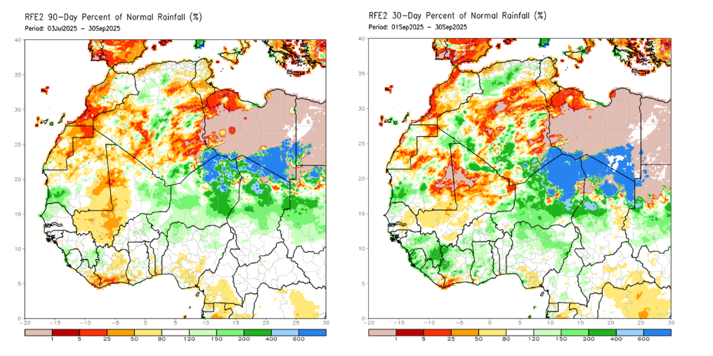 Rainfall in West Africa over the past 90 days has been below normal. For the last three months, we have seen consistently low rainfall, which is more likely to affect harvest figures in December–February. However, the data for the past 30 days will probably provide a good basis for the formation of the next mid-crop.