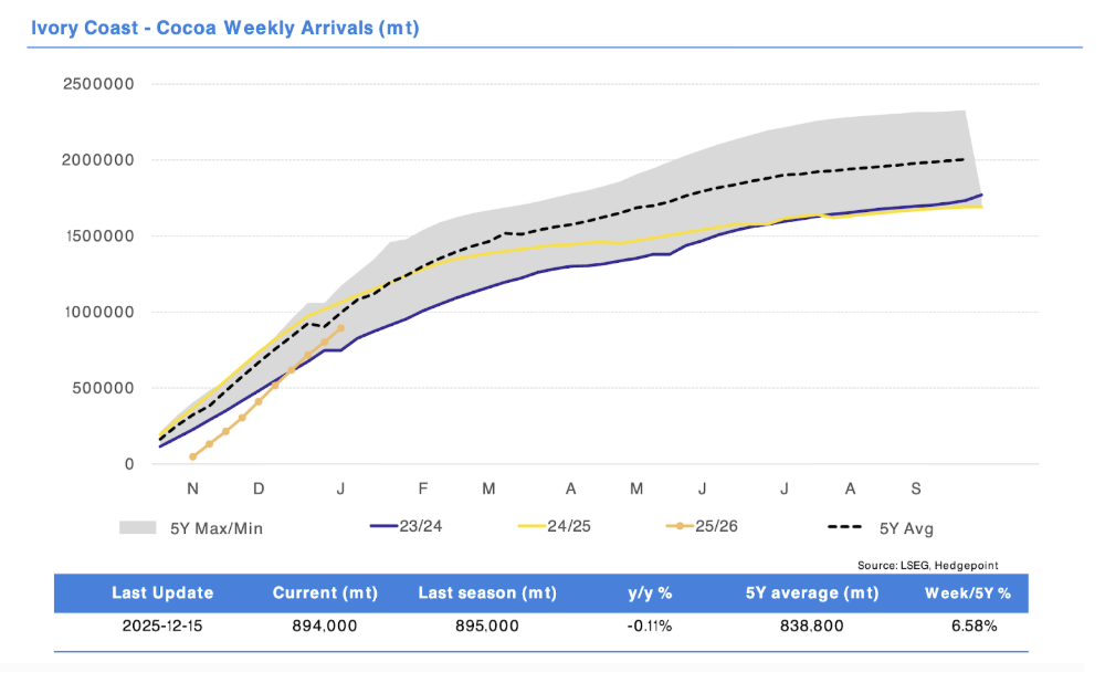 Прогноз на урожай какао в Кот-д’Ивуаре на этот год остается более или менее оптимистическим, цифры приходов в порты улучшались в последний месяц если не брать в расчет последнюю неделю года, в порты доставлено 1 002 000 тонны по сравнению с 1 027 000 тон годом ранее. Показатели хуже чем в среднем за последние 5 лет.