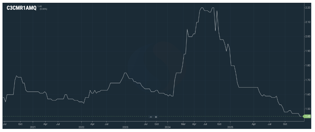 Сертифицированный остаток на складах в США снизился на 4% в декаябре. Количество мешков на 26.12 составляет чуть более чем 1 625 000 штук, что составляет менее 100 000 тон.