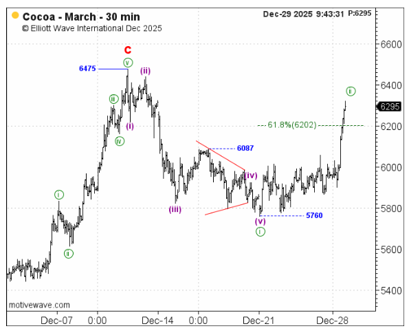 В данный момент мы вероятно завершаем или завершили 2ую волну роста на коротком 30 минутном графике, учитывая сильный импульс который привел к росту в начале декабря, скорее всего мы завершили текущий период снижения цен на какао-бобы с короткой перспективой. Однако нельзя отрицать что тот факт , что подсчет волн как на картинке выше , дает нам повод увидеть дальнейшее снижение цен в среднесрочной перспективе. Данный сценарий отменяется при пробитии ценой уровня в 6475 доллара по Ньй Йорку.