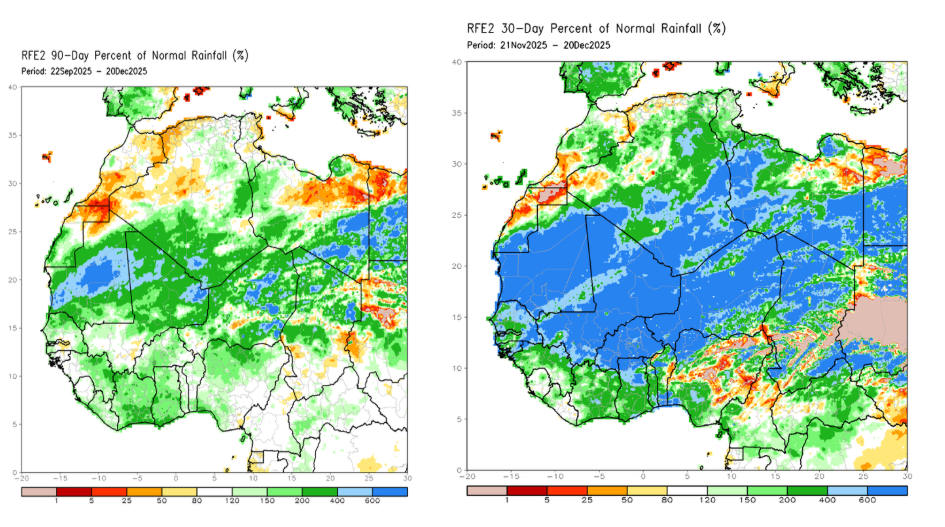 Количество дождей в Западной Африке в последние 30 и 90 дней значительно выше нормы, такие графики редкость, это должно будет повлиять на развитие плодов в период сбора май-июнь 2026 года. Если не будет затопления деревьев и развития грибковых заболеваний у деревьев какао.