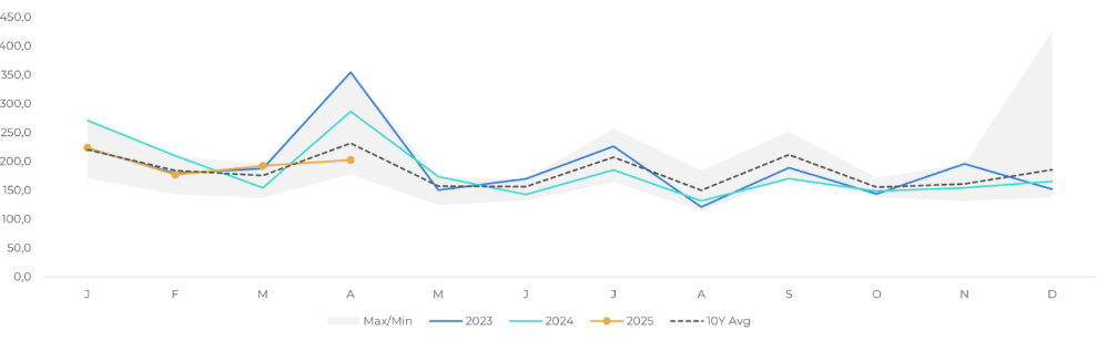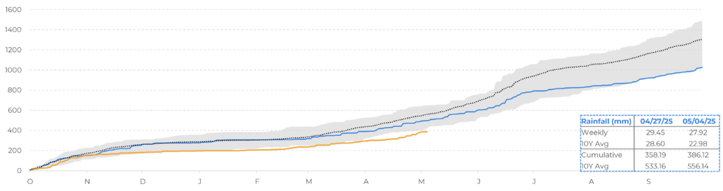 В целом данные по осадкам за сезон 24/25 ниже 5 летних средний данных а так же ниже чем годом ранее.
