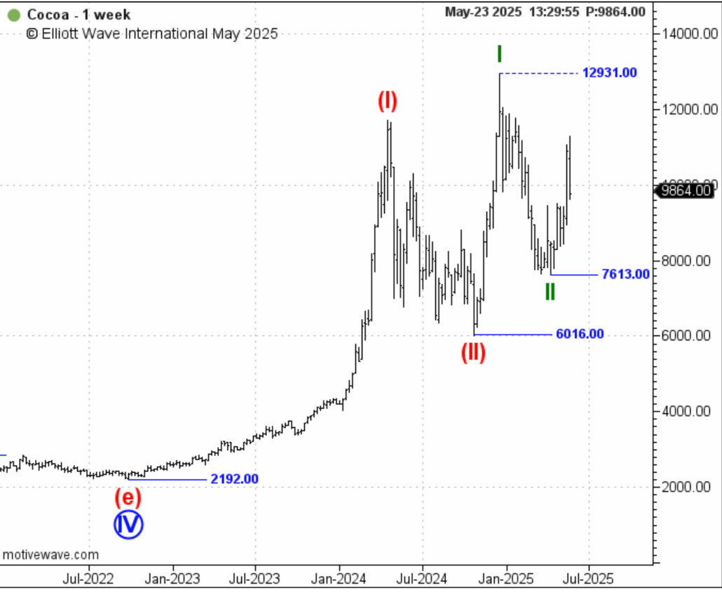 Рынки в мае росли на новостях об очередном неурожае, спустя 3 месяца после того как этот сценрий начал реализовываться, что по нашему мнения довольно странно покупать старые новости, опять же мы предупреждали об этой тенденции еще 3 месяца назад. Завершив коррекцию волны 2 ниже чем ожидалось, предыдущий прогноз к росту цен остается в силе, по всем техническим правилам мы должны будем увидеть цену выше чем 12 931 доллара за тонну на бирже Нью Йорка.